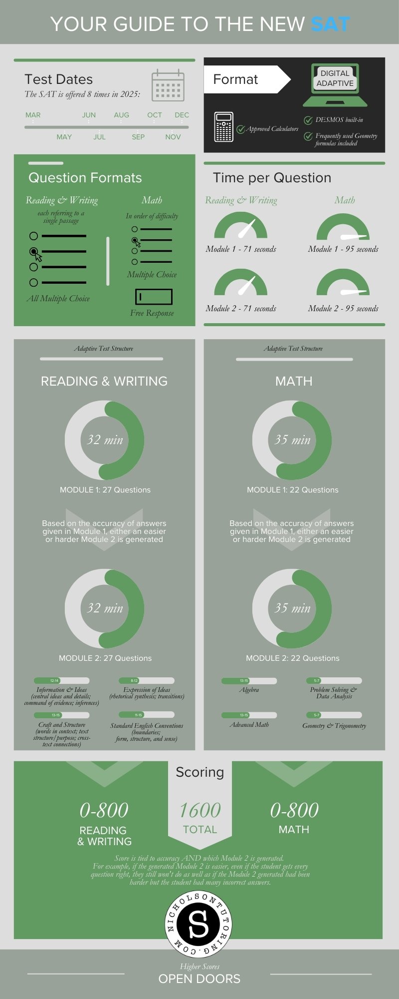 The test is now completely digital, including use of the built-in calculator called DESMOS. From start to finish, the SAT takes less than 2.5 hours. The test consists of two modules of Reading and Writing and two modules of Math, with a 10 minute break after the Reading and Writing modules.