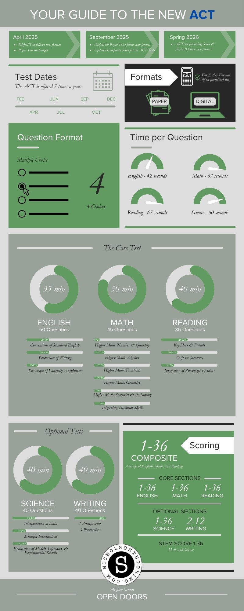 The new ACT will be available as an option for students beginning April 2025. The test will somewhat mimic the new SAT in that it will be digital and much shorter—about 2.5 hours. Additionally, the Science test will become optional, just like the Writing test. So far, everything else looks to be about the same as the existing ACT. We’ll be following closely the updates from ACT as they are released!